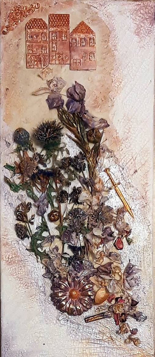 obraz zhotovený technikou Paverpol a prírodným materiálom, patinovaný akrylom