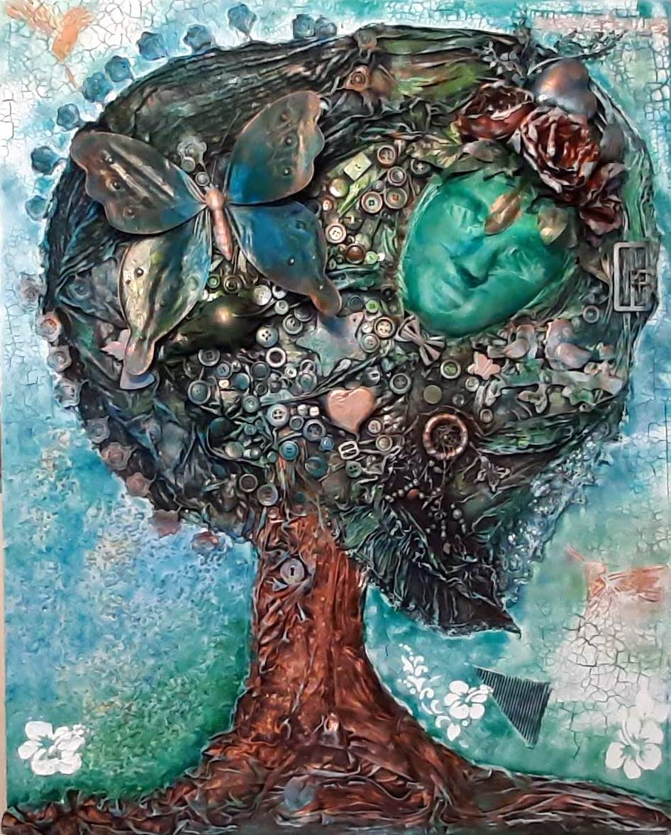 obraz “ V korune stromu“ zhotovený technikou Paverpol, patinovaný akrylom